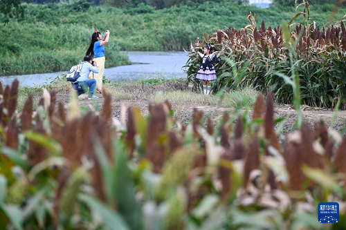 9月21日,游人在高粱地打卡拍照。(新华社记者 季春鹏 摄)