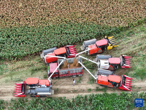 9月21日,收割机卸下收割的高粱(无人机照片)。(新华社记者 季春鹏 摄)