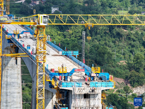 五步河双线特大桥全长1796米,跨越S207省道及长江支流五步河。此次合龙的五步河双线特大桥主跨总跨度392米,最高墩达105米。渝万高铁正线全长251公里,设计时速350公里,是国家“八纵八横”高速铁路主通道包(银)海、京昆通道的重要组成部分。