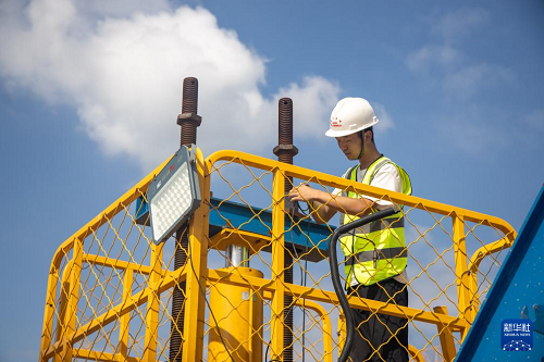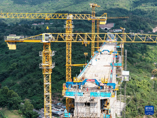9月24日,工人在渝万高铁五步河双线特大桥建设现场施工作业。(新华社记者 唐奕 摄)