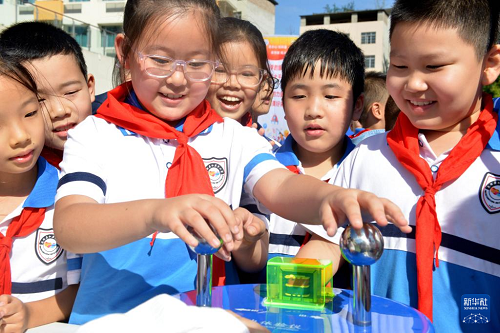 9月25日,四川省南充市南部县红岩子小学学生在体验趣味科普装置。(新华社发 张枥 摄)