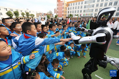9月25日,在甘肃省定西市安定区西关小学,学生和人形机器人互动。(新华社发 王克贤 摄)