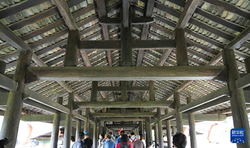 这是9月25日拍摄的三江侗族自治县的程阳永济桥。该桥建成于1924年,整座桥梁搭建时不用一钉一铆,主要由木料和石料建成,桥长近80米,宽近4米,高近12米,是我国建筑艺术中的珍品。(新华社记者 张枫 摄)
