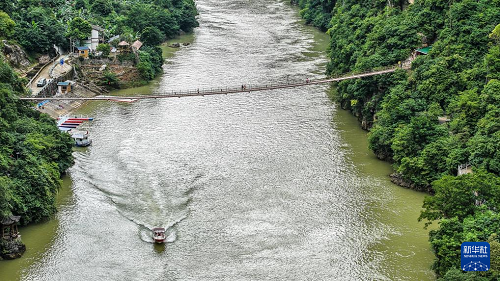 游客乘船游览花江大峡谷景区(9月27日摄,无人机照片)。(新华社记者 陶亮 摄)