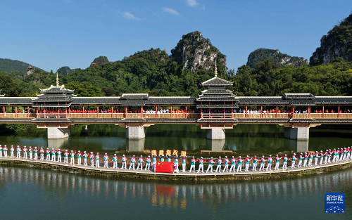 9月28日,在广西柳州市龙潭公园,人们共同唱响《我和我的祖国》(无人机照片)。(新华社发 黎寒池 摄)