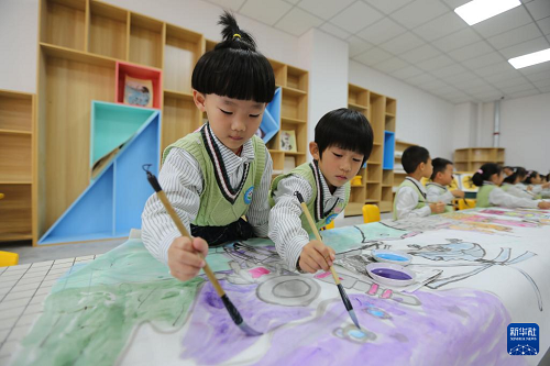 9月28日,甘肃省定西市安定区幼儿园的小朋友在绘制《我爱你中国》长卷。(新华社发 王克贤 摄)