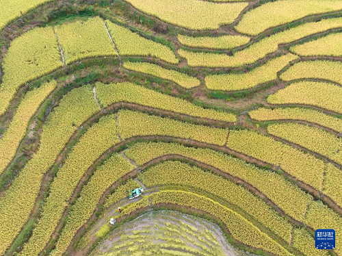 10月10日,湖北省宜昌市秭归县沙镇溪镇长春村村民驾驶农机在田间收获水稻(无人机照片)。(新华社发 雷勇 摄)