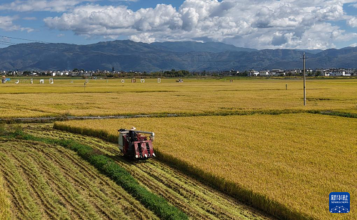 10月10日,工人在云南省大理市喜洲镇水稻种植基地收割水稻(无人机照片)。(新华社发 梁志强 摄)