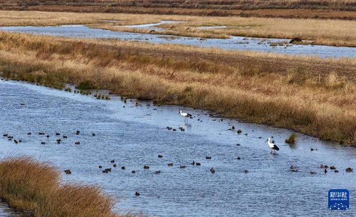 10月14日在黑龙江省同江市三江口国家湿地公园拍摄的东方白鹳和野鸭(无人机照片)。(新华社发 刘万平 摄)