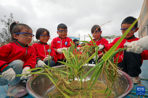 10月15日,云南省曲靖市陆良县大莫古镇中心幼儿园的孩子们在校内劳动基地体验打稻穗。(新华社发 王勇 摄)