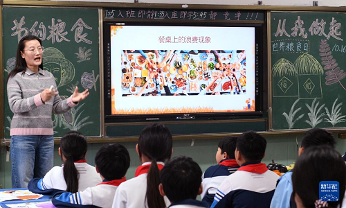10月15日,河南省商丘市夏邑县育才学校老师在世界粮食日主题班会上讲解粮食知识。(新华社发 苗育才 摄)
