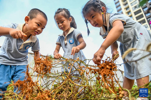 10月15日,在湖南省永州市道县城东幼儿园,小朋友在体验采收花生。(新华社发 蒋克青 摄)