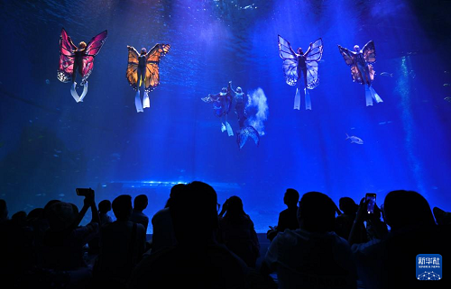 10月18日,游客在海南海洋欢乐世界度假区观看水下表演。(新华社记者 郭程 摄)
