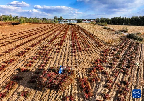10月19日,在通辽市开鲁县东风镇六合堂村,村民在田地里收获干椒(无人机照片)。(新华社记者 连振 摄)