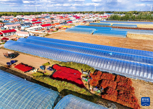 10月19日,在通辽市开鲁县东风镇六合堂村,村民在田地里晾晒红干椒。(新华社记者 连振 摄)