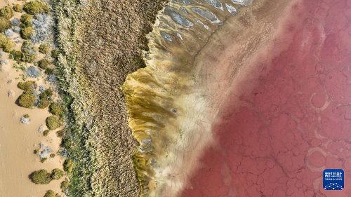 10月22日拍摄的巴丹吉林沙漠中的红海子(无人机照片)。(新华社记者 贝赫 摄)
