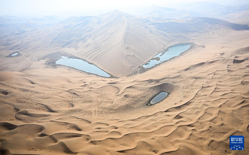 秋日,位于内蒙古阿拉善盟阿拉善右旗的世界遗产巴丹吉林沙漠—沙山湖泊群褪去炙热,绵延的沙丘披上柔和金光,与点缀其间的湖泊相映成趣,勾勒出一幅静谧而壮丽的自然画卷。