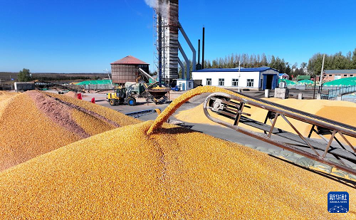 10月23日在北大荒集团黑龙江尾山农场有限公司一烘干企业拍摄的玉米烘干作业现场(无人机照片)。(新华社发 陆文祥 摄)