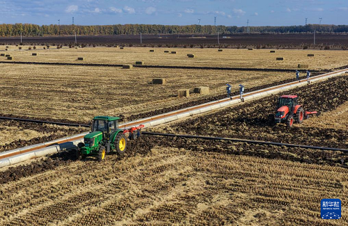 10月23日,农机在黑龙江北大荒农业股份友谊分公司田间进行整地作业 (无人机照片)。(新华社发 徐宏宇 摄)