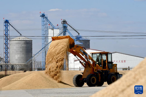 10月23日,铲车在黑龙江北大荒农业股份八五六分公司第六管理区一处晒场翻晒粮食。(新华社发 王金彬 摄)