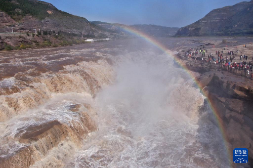 10月27日,游客在山西吉县黄河壶口瀑布景区欣赏“彩虹桥”景观。(新华社发 吕桂明 摄)