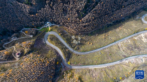 10月26日在位于宁夏固原市隆德县的宁夏六盘山红军长征景区拍摄的秋景(无人机照片)。(新华社记者 王鹏 摄)