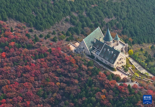 10月28日拍摄的天津市蓟州区一度假酒店秋景(无人机照片)。(新华社记者 李然 摄)