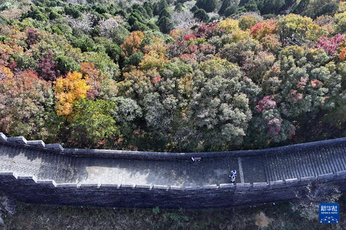 10月28日拍摄的天津市蓟州区黄崖关长城秋景(无人机照片)。(新华社记者 李然 摄)