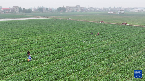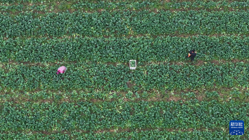 10月30日,菜农在沅江市草尾镇乐园村蔬菜田里采收蔬菜(无人机照片)。(新华社记者 陈振海 摄)