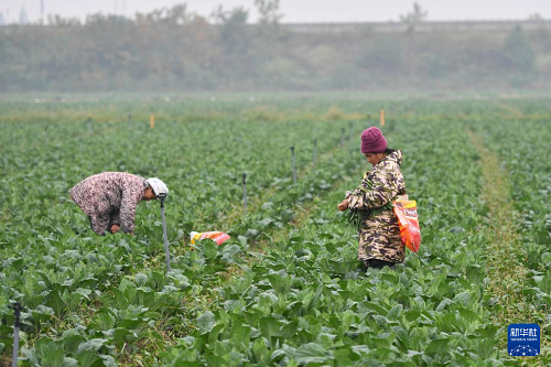 10月30日,菜农在沅江市草尾镇乐园村蔬菜田里采收。(新华社记者 陈振海 摄)