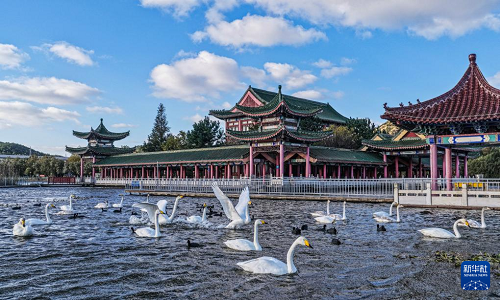 11月2日,在山东省荣成市成山镇西霞口隆霞湖公园,大天鹅在栖息、觅食(无人机照片)。(新华社发 李信君 摄)