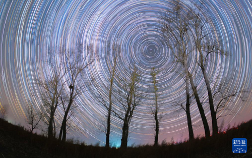 10月31日在黑龙江省富锦市拍摄的秋日星空下的秋树(堆栈合成照片)。(新华社发 庚喜庆 摄)