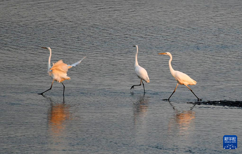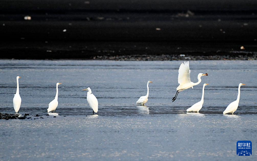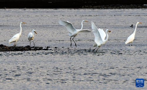 11月4日,在黑龙江省牡丹江市江心岛附近的江滩浅流中,白鹭在觅食。(新华社发 张春祥 摄)