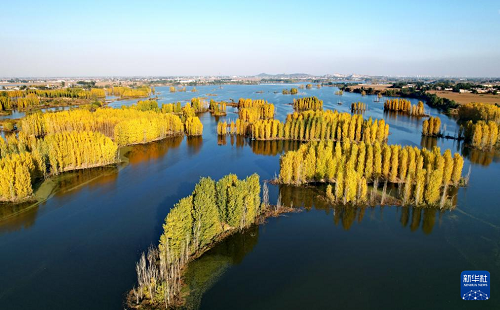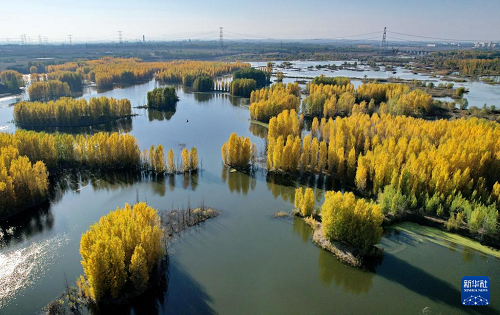 初冬时节,在河北省邢台市隆尧县亦城村泜河沿岸,树叶金黄,与水面、河岸相映衬,勾勒出一幅美丽和谐的自然画卷。