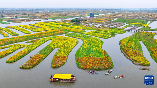 11月10日,游客在江苏省兴化市千垛景区乘船游玩(无人机照片)。(新华社发 周社根 摄)