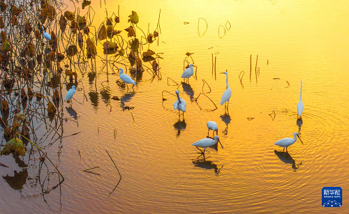 11月10日,鸟儿在江苏兴化里下河国家湿地公园内栖息(无人机照片)。(新华社发 周社根 摄)
