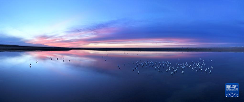 在甘肃省酒泉市阿克塞哈萨克族自治县,白鹭在冬不拉水库栖息觅食(无人机照片,11月9日摄)。(新华社发 高宏善 摄)