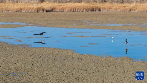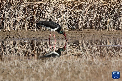 11月12日,黑鹳在张掖黑河湿地国家级自然保护区高台段一处湿地浅滩觅食。(新华社记者 郎兵兵 摄)