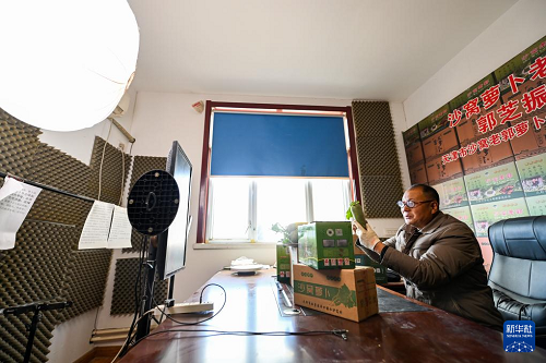 11月20日,在天津市西青区辛口镇一家萝卜专业合作社,农户在直播推广沙窝萝卜。(新华社记者 赵子硕 摄)
