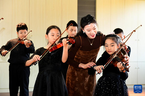 11月26日,在济南市市中区泉海小学,音乐老师夏霄霏在指导学生拉小提琴。(新华社记者 郭绪雷 摄)