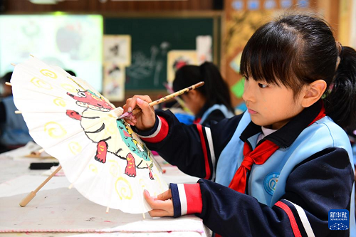 11月25日,在济南市市中区爱都小学,一庭香国画社团的学生在画画。(新华社记者 郭绪雷 摄)