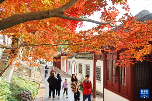 12月8日,游客在浙江省嘉兴市南湖景区湖心岛观赏枫叶。(新华社发 金鹏 摄)