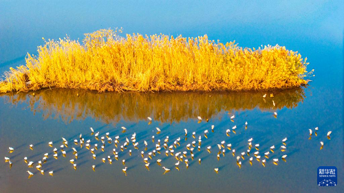 12月8日,群鸟在江苏兴化里下河国家湿地公园内栖息、觅食(无人机照片)。(新华社发 周社根 摄)