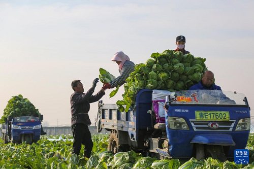 12月18日,农民在山东省东营市广饶县李鹊镇将收获的白菜装车。(新华社发 刘云杰 摄)