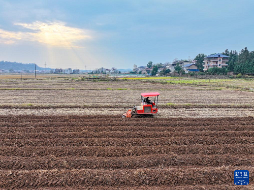 12月17日,湖南省常宁市洋泉镇农民驾驶农机在翻耕农田(无人机照片)。(新华社发 周秀鱼春 摄)