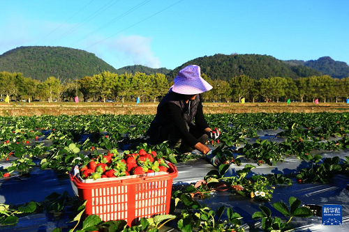 12月18日,云南省腾冲市和顺镇农户在采摘草莓。(新华社发 赵辉 摄)