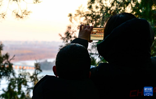 12月21日,游客在颐和园万寿山上拍摄十七孔桥“金光穿洞”美景。(新华社记者 陈晔华 摄)