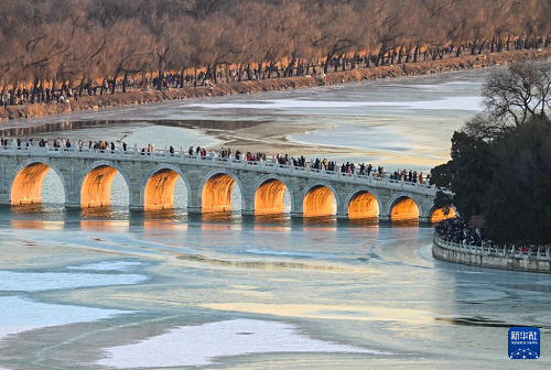 12月21日是冬至节气,北京颐和园十七孔桥的“金光穿洞”景观吸引了众多游客与摄影爱好者观赏拍摄。