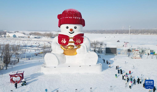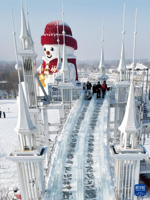 12月24日在哈尔滨外滩德嘉雪人码头冰雪景区拍摄的大雪人(无人机照片)。(新华社发 刘洋 摄)