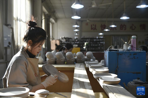 12月25日,工作人员在河北省曲阳县一家定瓷生产企业的车间里加工定瓷产品。(新华社记者 鲁鹏 摄)